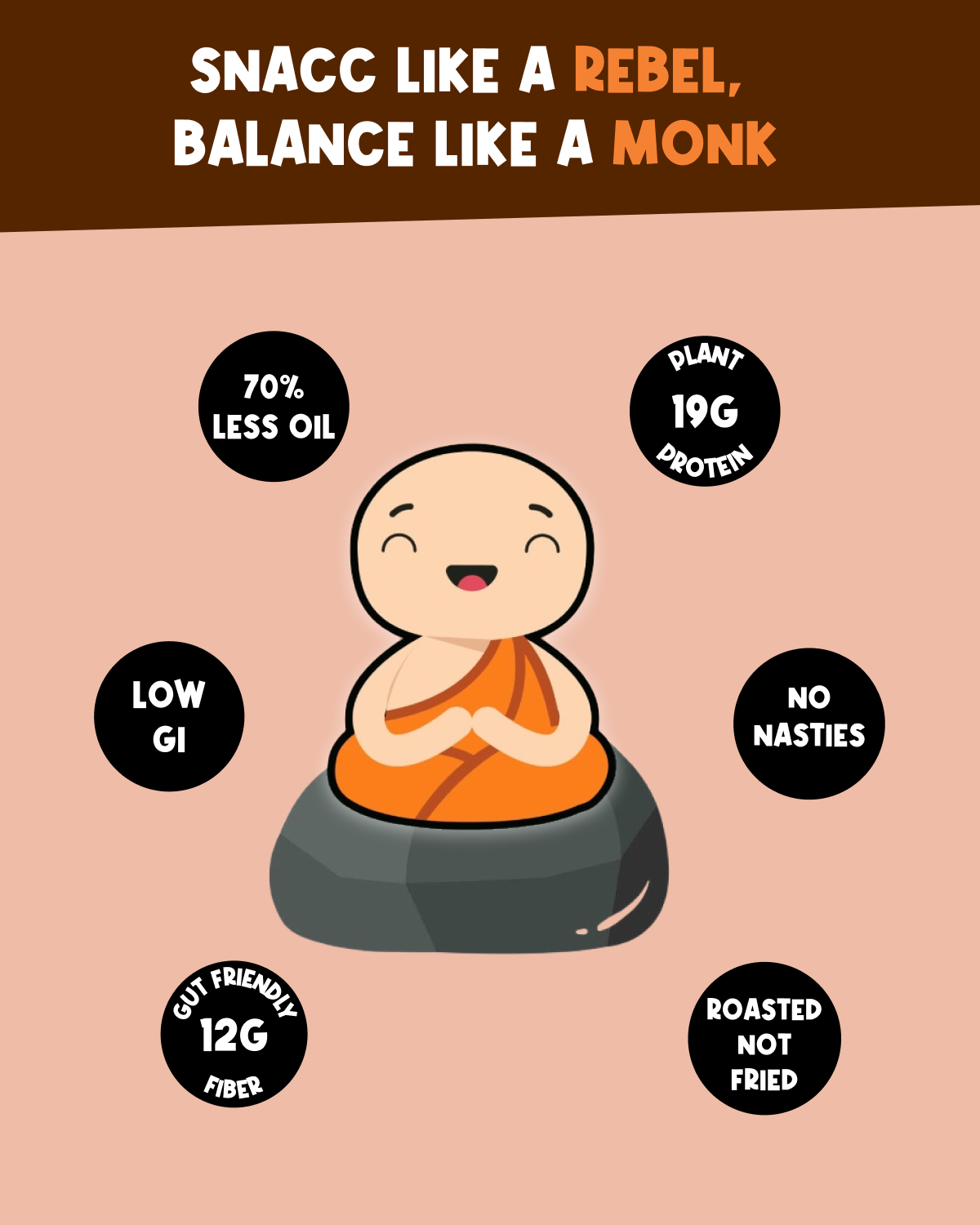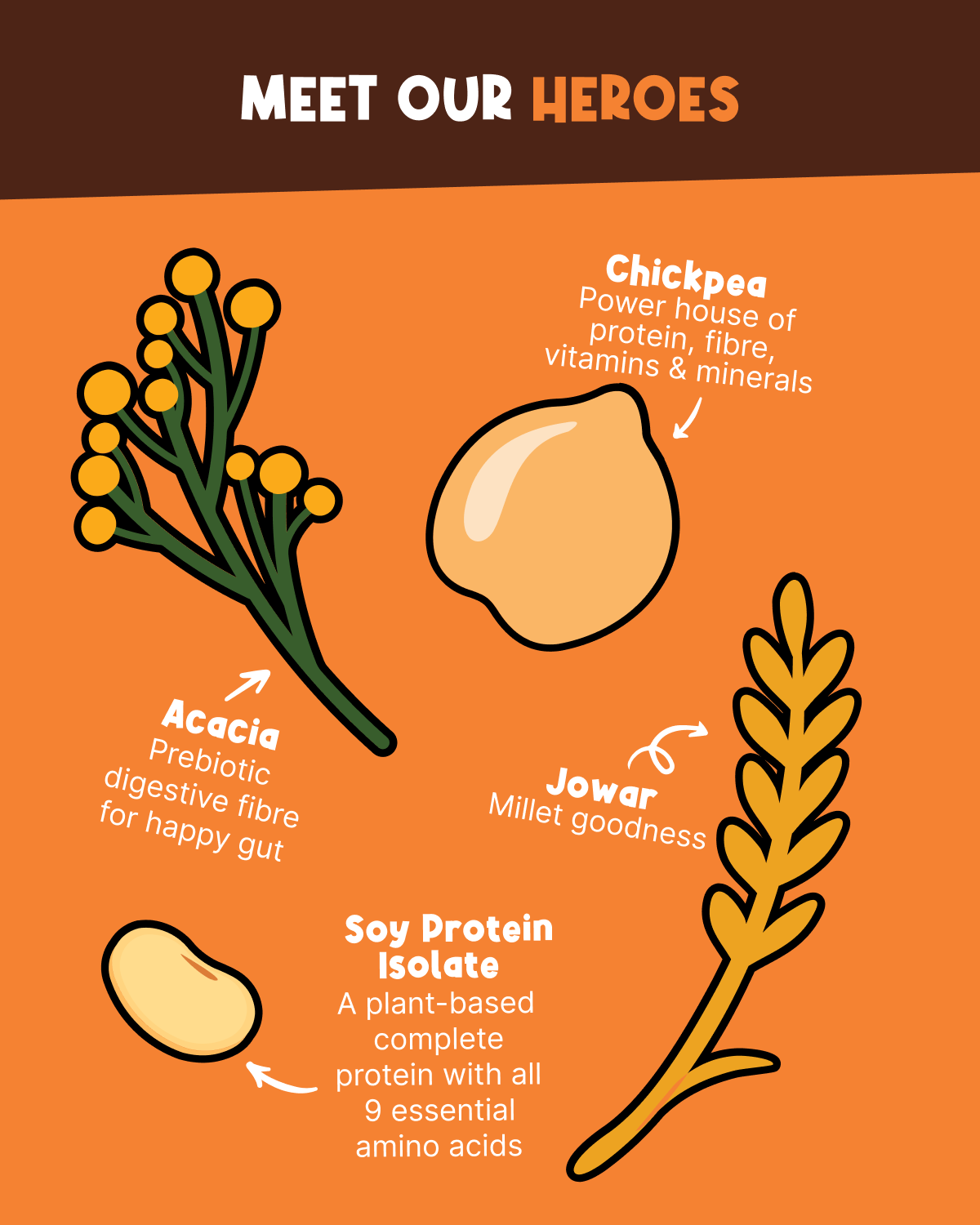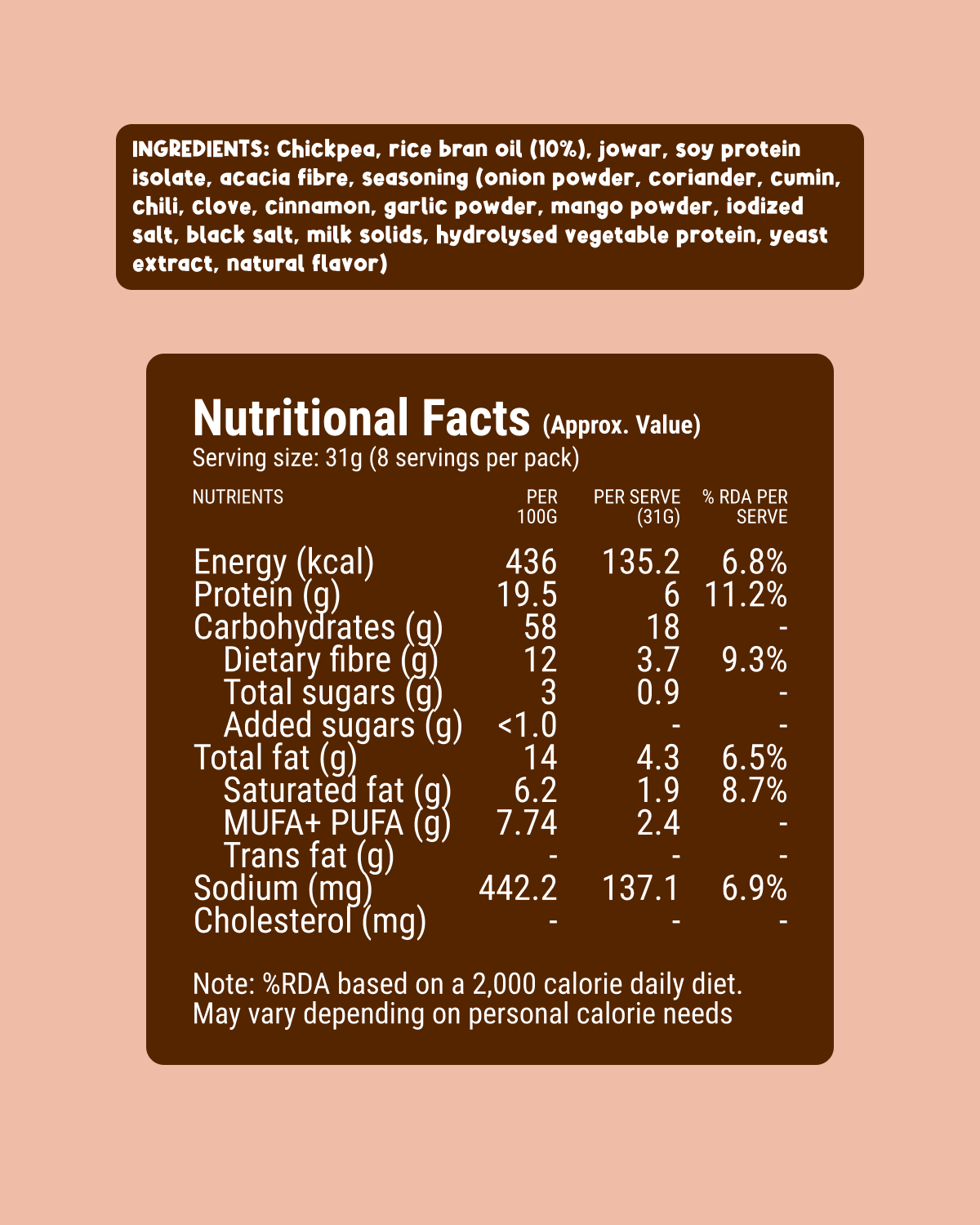 Chickpea, rice bran oil (10%), jowar, soy protein isolate, acacia fibre, seasoning (onion powder, coriander, cumin, chili, clove, cinnamon, garlic powder, mango powder, iodized salt, black salt, milk solids, hydrolysed vegetable protein, yeast extract, natural flavor)