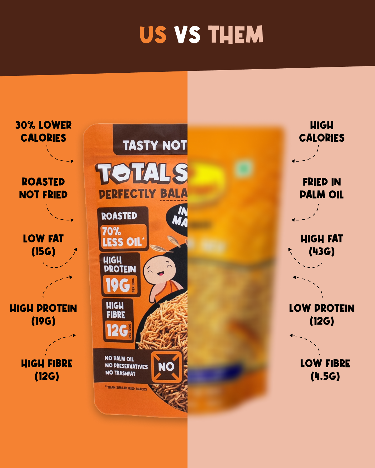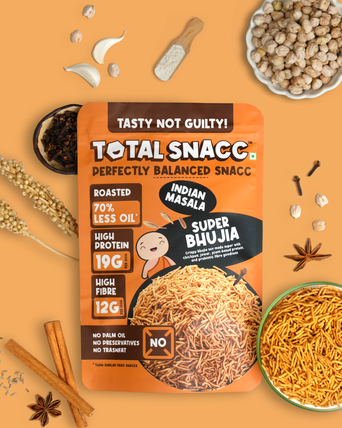 Remember regular bhujia? Yeah, this isn’t that. We gave the desi legend a glow-up - lighter, crunchier, and loaded with protein + fibre so you don’t crash after snaccing. Made with a blend of chickpea, jowar, soy protein isolate, & prebiotic acacia fibre, Total Snacc 100% Roasted Super Bhujia is perfectly balanced for Macros and delivers: