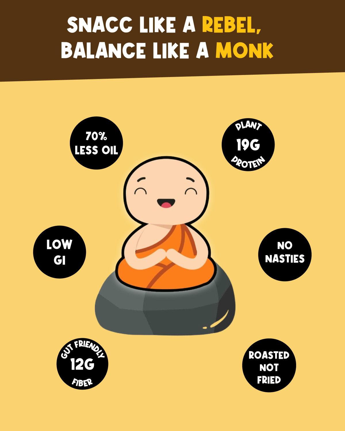 A tangy namkeen medley of jowar, chanajor, cashews, peanuts, & our signature protein-fibre packed crispies. Crunchy. Tasty Not Guilty. Macro-balanced.