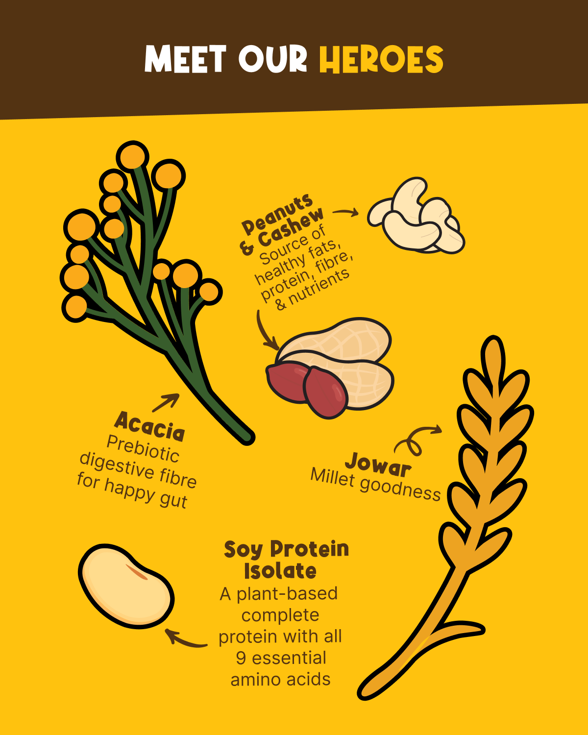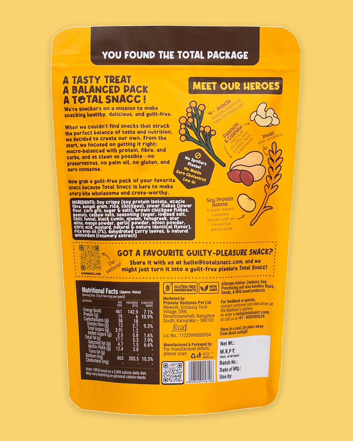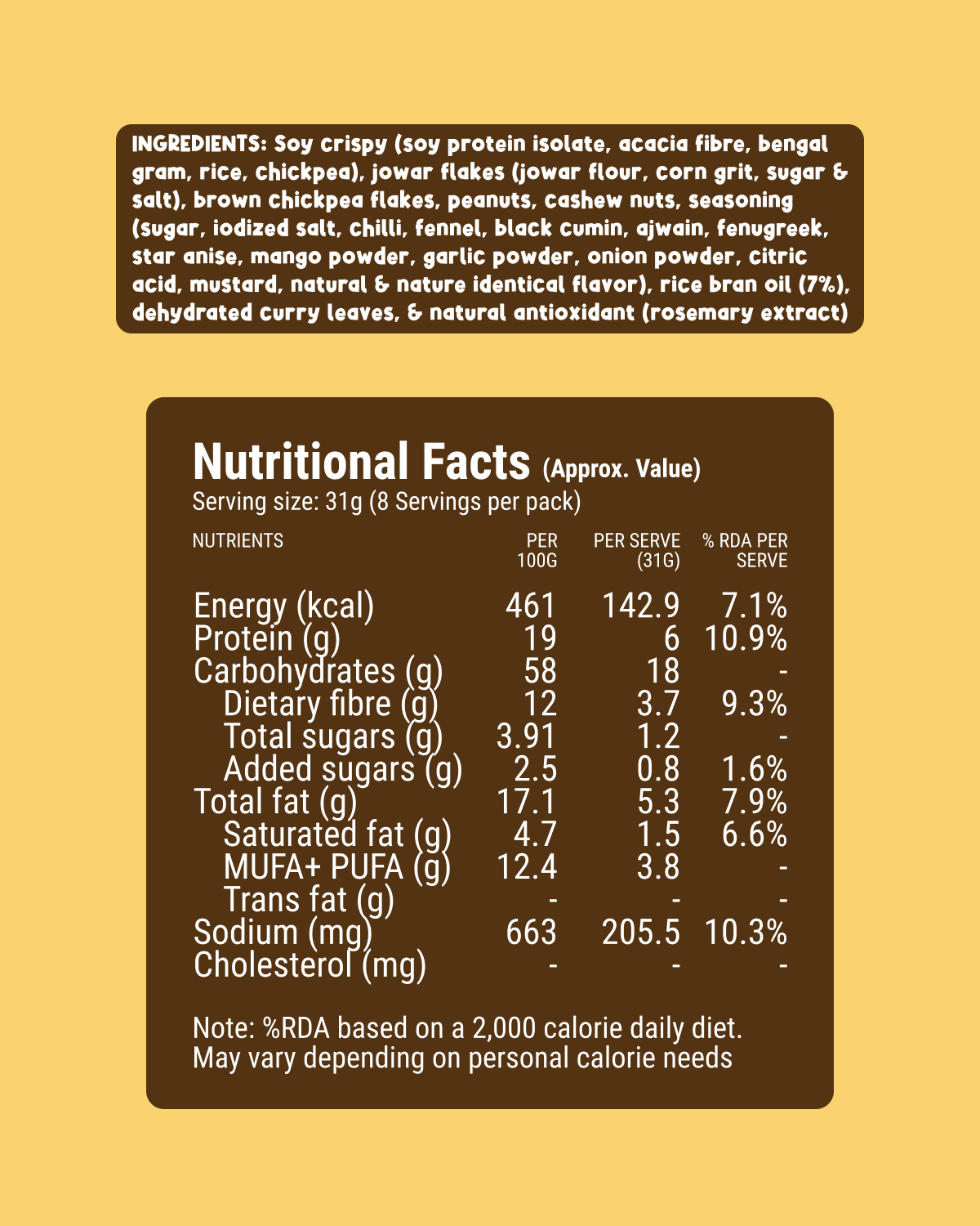 This isn't just namkeen. Its tangy, crunchy, achari remix of jowar, chanajor, cashews, peanuts, & our signature power-packed high protein high fibre crispies. A desi classic with a TOTAL SNACC glow-up.  Basically, snack-goals unlocked! Enriched with soy protein isolate & prebiotic acacia fibre, this SNACC is perfectly balanced for Macros and delivers: