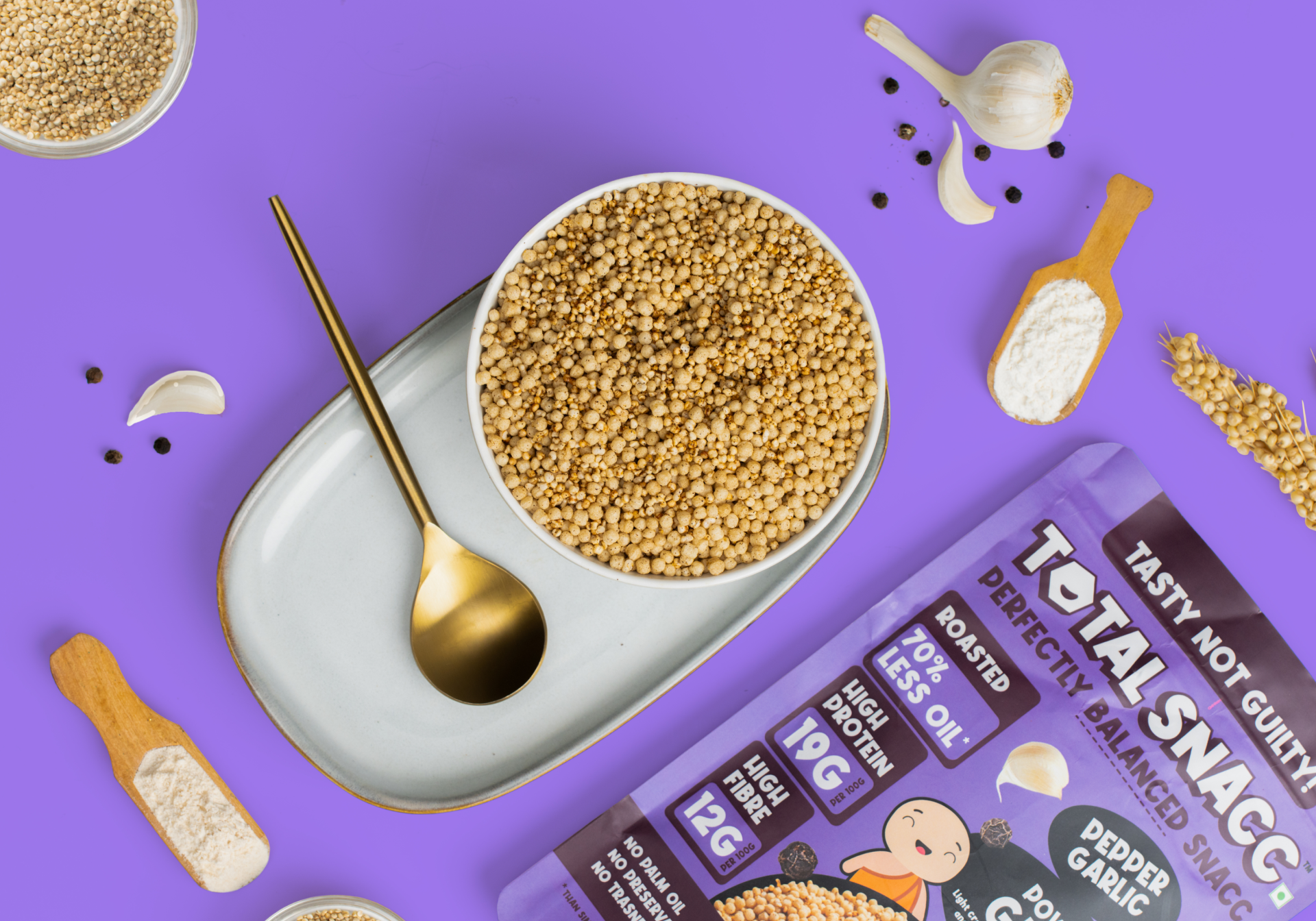 Your regular grains hit the gym, found its spice, and came back with protein & fibre gains. Meet Power Puff Grains - roasted, pepper-garlic puffs that crunch harder, fuel smarter, and feel like a super-snack. Made with a blend of quinoa pops, jowar crispies, and our signature power-packed high protein high fibre crispies, this SNACC is perfectly balanced for Macros and delivers: